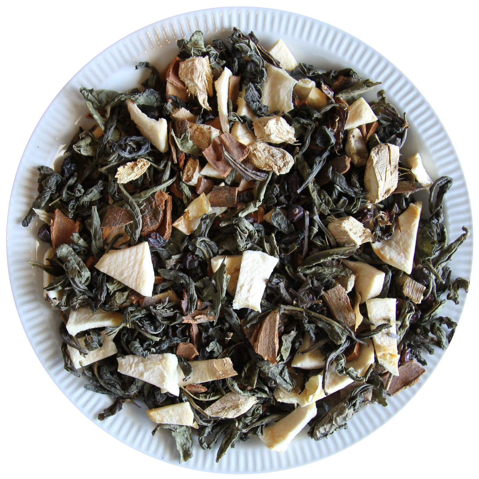 Ingredienti: Tè Verde (50%) , Mela disidratato (15%), Cannella corteccia (15%), Zenzero secco (15%),