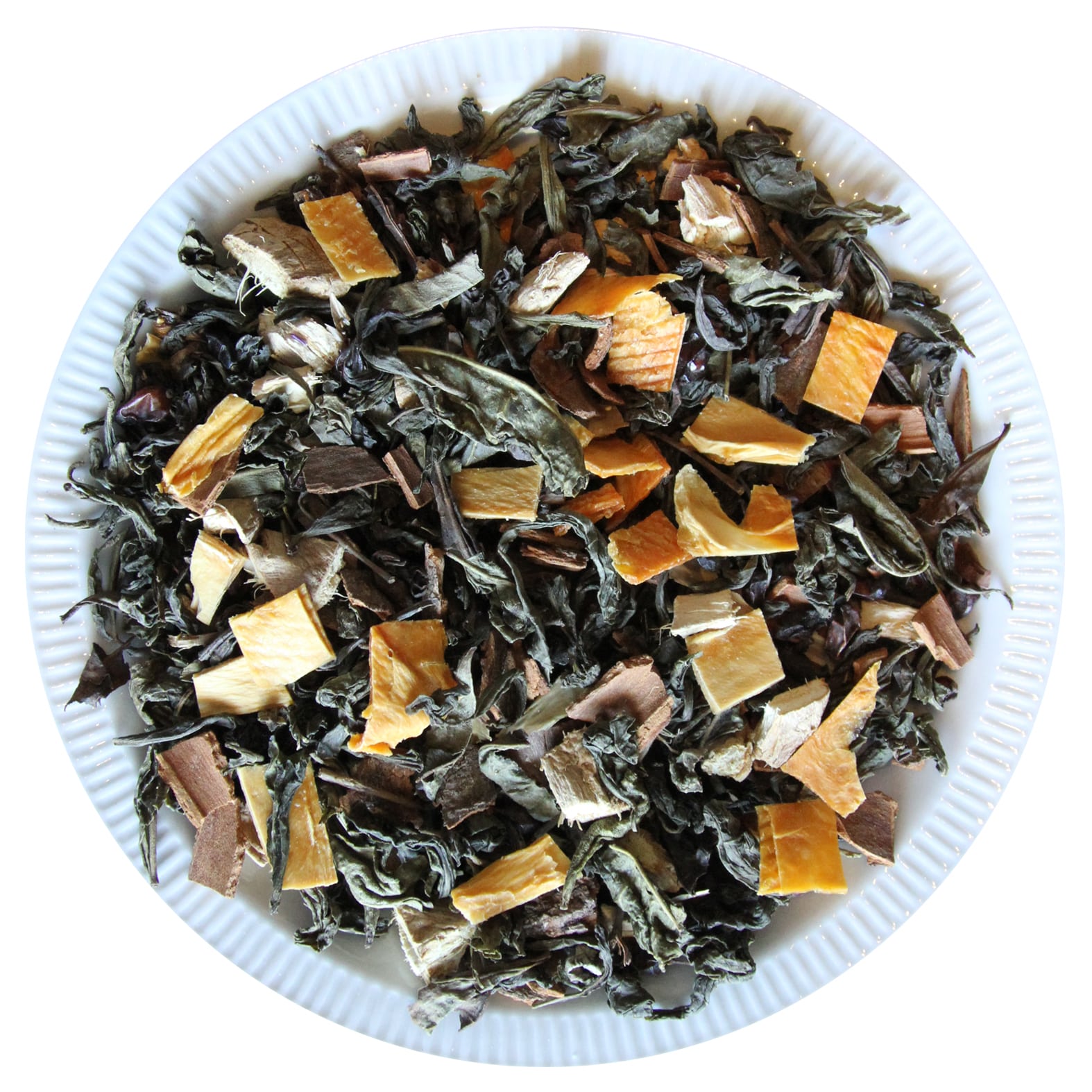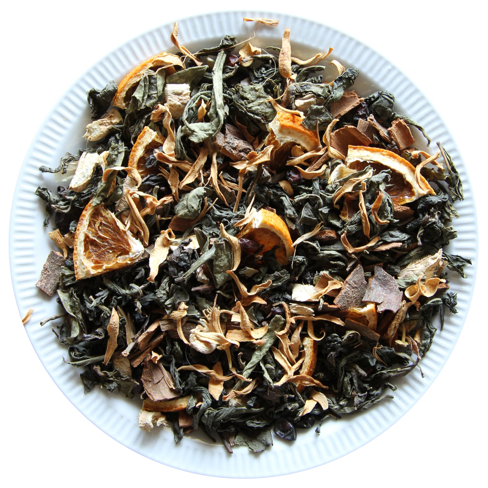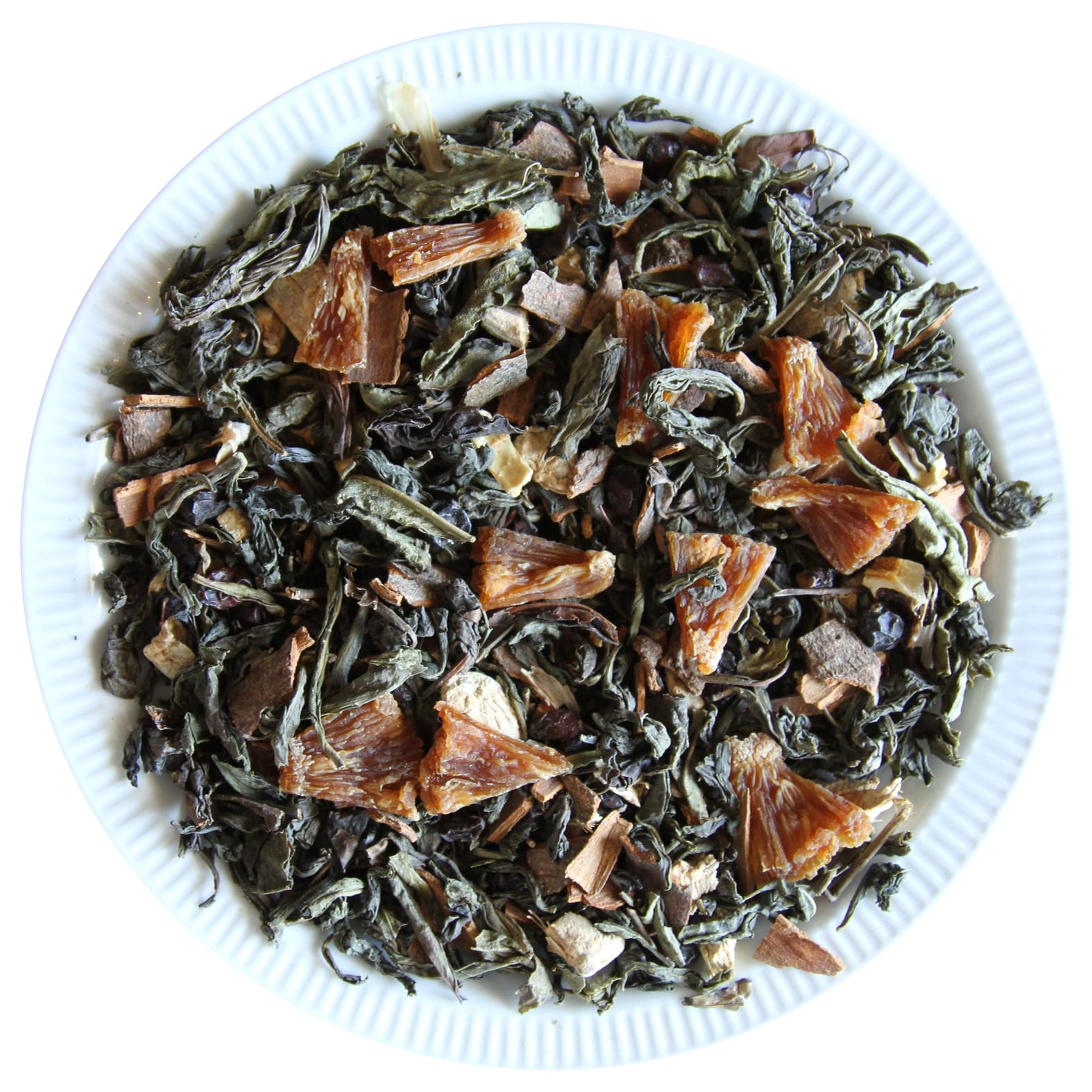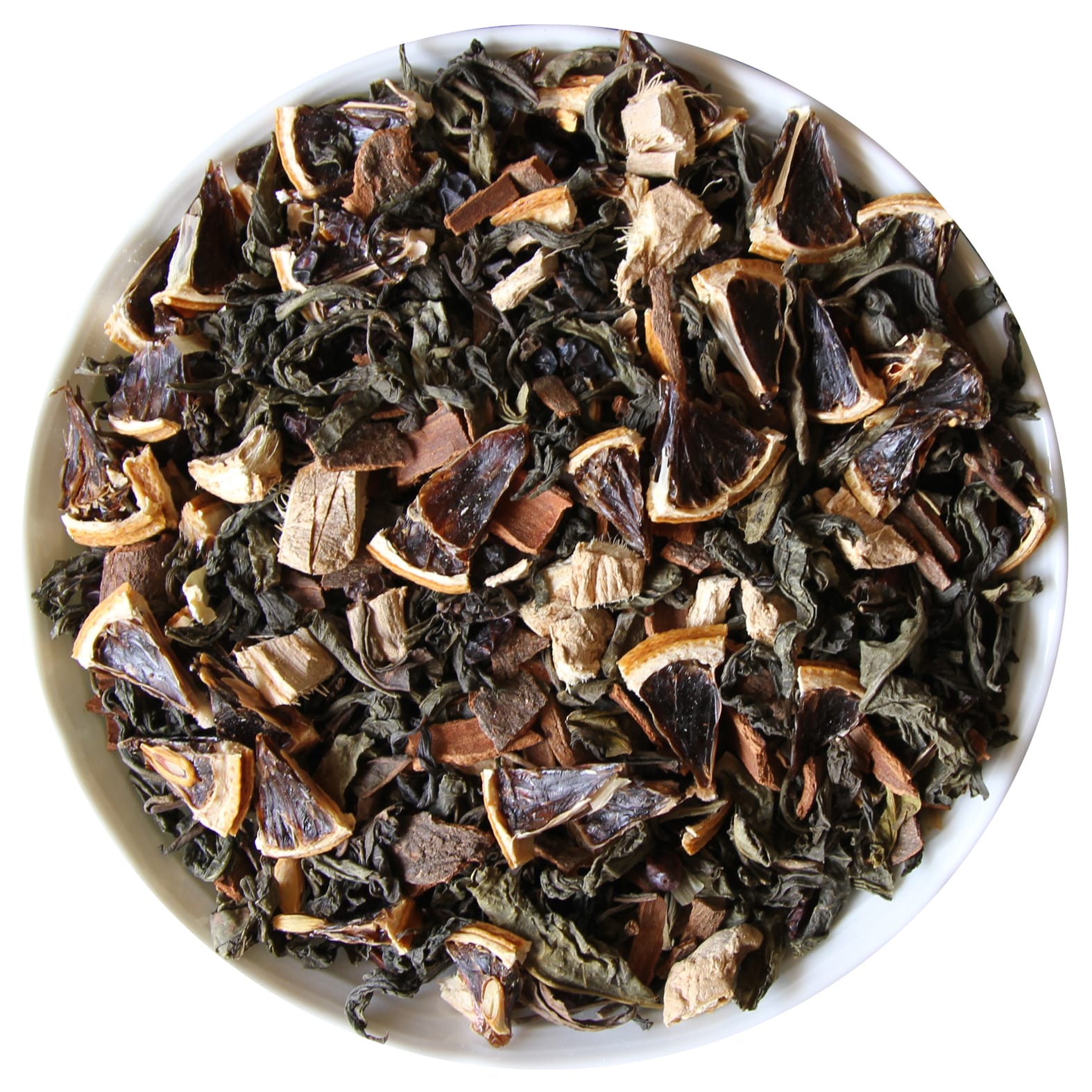 Ingredienti: Tè Verde (50%) , Arancia disidratato (15%), Cannella corteccia (15%), Zenzero secco (15%), Fiori d’arancio (5%)