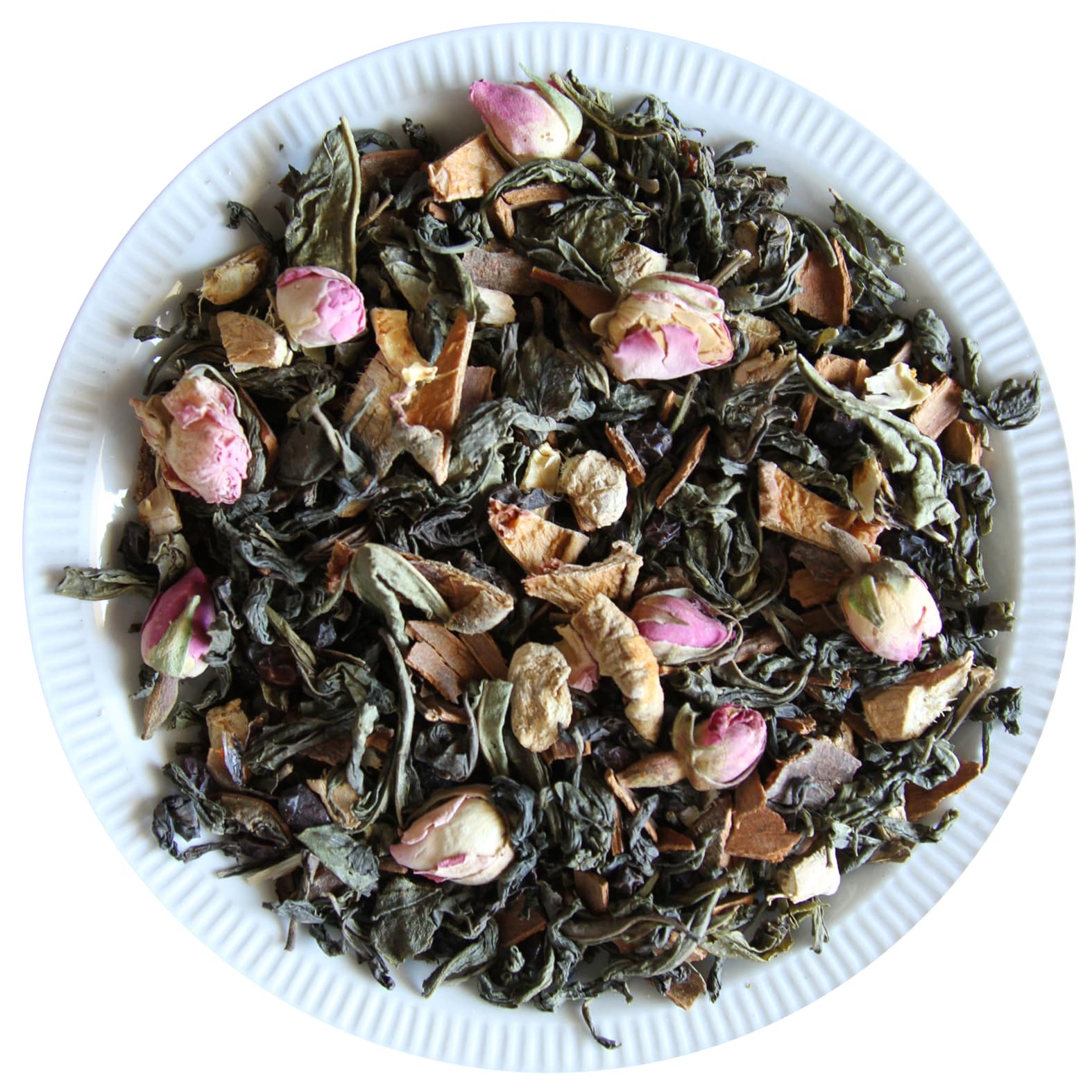 Ingredienti: Tè Verde (50%) , Pesca disidratato (15%), Cannella corteccia (15%), Zenzero secco (15%), Petali di rosa (5%)